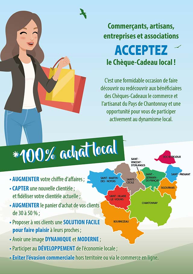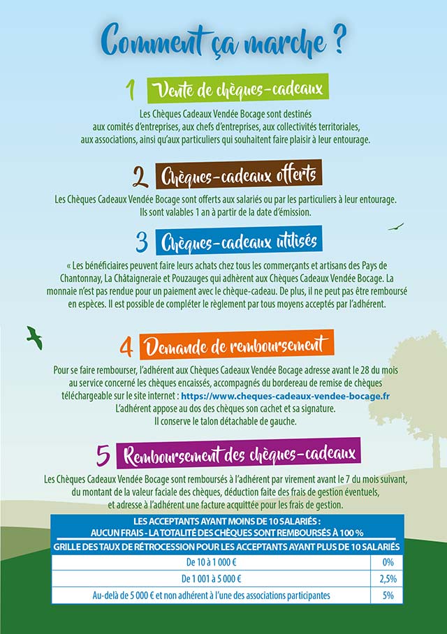 ATTENTION : Les documents téléchargeables ci-dessus sont la propriété de l’association Chèques Cadeaux Vendée Bocage. Il ne peuvent être reproduit sans autorisation de la part de l’association. Tous les commerçants et artisans des 3 pays (Chantonnay, La Châtaigneraie et Pouzauges) peuvent adhérer au dispositif. Toutefois leur adhésion et soumise à l’acceptation du bureau de l’association Chèques Cadeaux Vendée Bocage. Pour plus d’information merci de contacter le référent local par l’intermédiaire du mail ci-dessous.