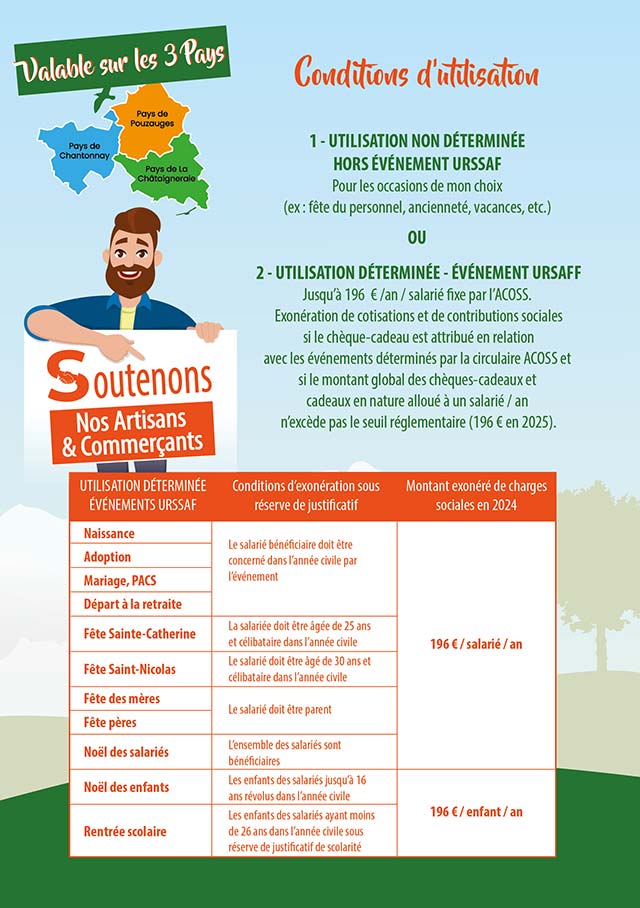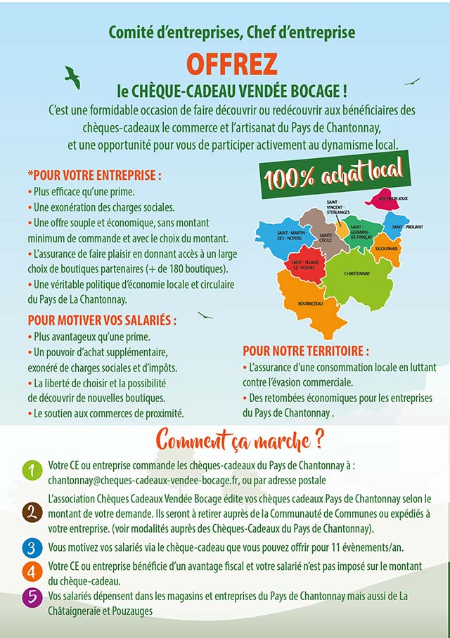 ATTENTION : Les documents téléchargeables ci-dessus sont la propriété de l’association Chèques Cadeaux Vendée Bocage. Il ne peuvent être reproduit sans autorisation de la part de l’association. Toutes les ENTREPRISES des 3 pays (Chantonnay, La Châtaigneraie et Pouzauges) peuvent acheter des Chèques Cadeaux Vendée Bocage pour leurs salariés. Pour plus d’information merci de contacter le référent local par l’intermédiaire du mail ci-dessous.