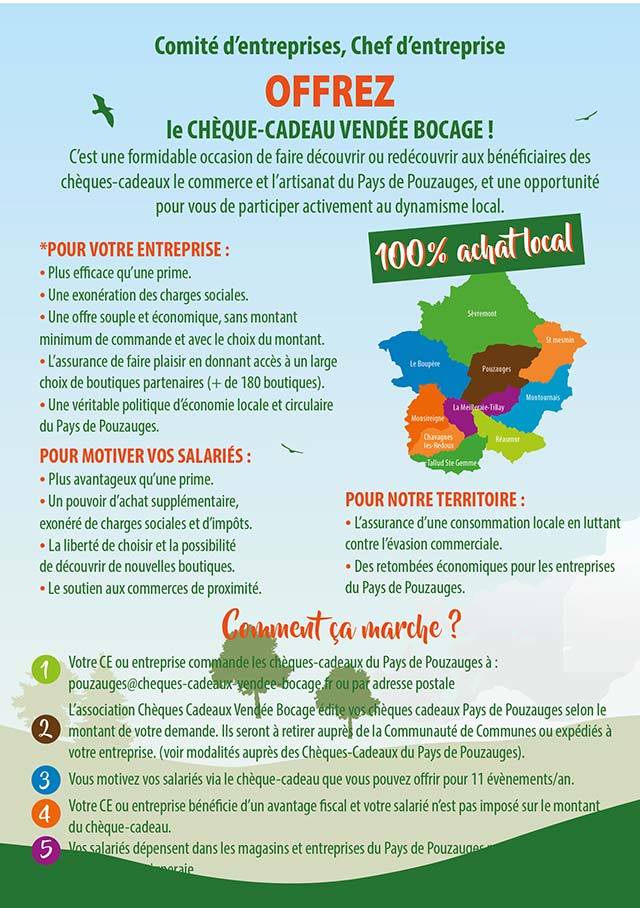 ATTENTION : Les documents téléchargeables ci-dessus sont la propriété de l’association Chèques Cadeaux Vendée Bocage. Il ne peuvent être reproduit sans autorisation de la part de l’association. Toutes les ENTREPRISES des 3 pays (Chantonnay, La Châtaigneraie et Pouzauges) peuvent acheter des Chèques Cadeaux Vendée Bocage pour leurs salariés. Pour plus d’information merci de contacter le référent local par l’intermédiaire du mail ci-dessous.